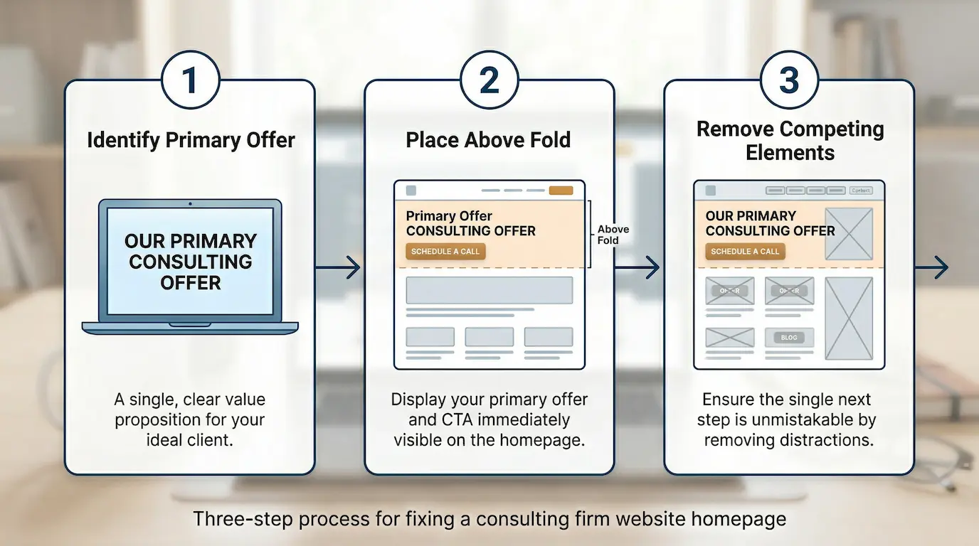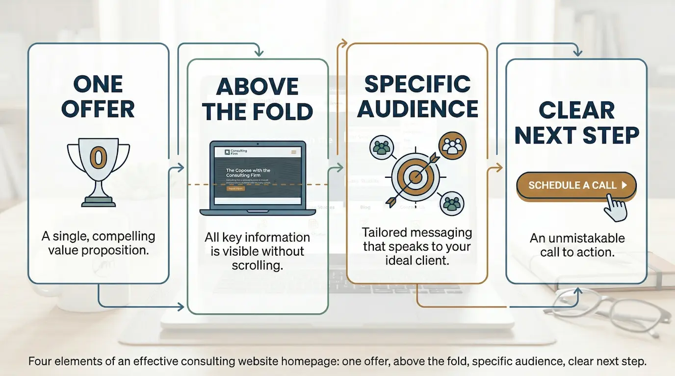 "Four elements of an effective consulting website homepage: one offer, above the fold, specific audience, clear next step"