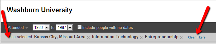 Clicking on a category adds a filter, narrowing the connection results. Filters can be used in combination (where they live + what they do). You can view (and clear) your filters in the light gray bar underneath the attendance selectors: