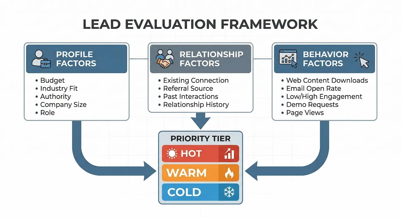 Keep your evaluation criteria to 5-7 factors. Define exactly what happens for each tier. Put the follow-up actions in your calendar or CRM the moment you categorize a lead. Simple systems get used; complex ones don’t.